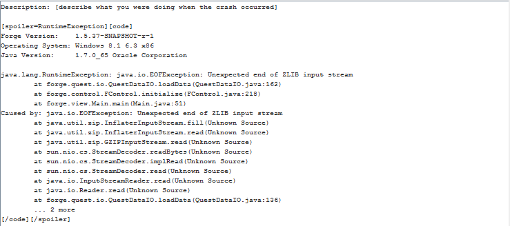 Your quest file has been corrupted for some reason. There's backups of your quests available in your "C:\Users\YourName\AppData\Roaming\Forge\quest\saves" folder. Delete the corrupt .dat file for your quest and copy and paste the .dat.bak file, renaming it to have just .dat at the end. You may need to show hidden files and folders in Windows to get to AppData.Ryujii Kami wrote:Deleted all forge files and redownloaded, attempted to launch, and got this