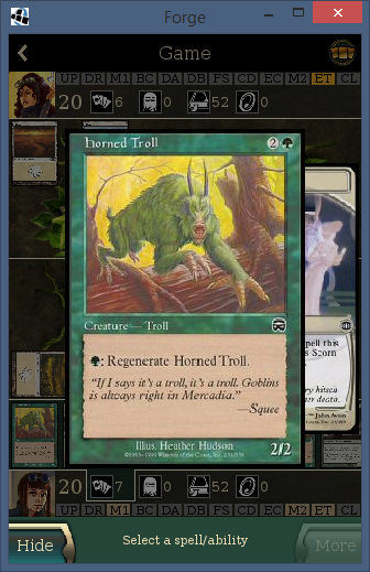 I think selection of SpellAbility should be ok this way. I still haven't had a chance to actually try it out yet, so aside from conjecture of screenshots I can't tell how it feels. In this case, does the back button cancel you out of zoomed in mode? So if I have a creature like Morphling and I click next to see all the SAs, then I get to the last one and I realize I wanted the second to last, do I have to scroll ALL the way back around? Or is there a way to goto the previous one?drdev wrote:So I've got an early version of card zoom working. Check it out:CardZoom.png