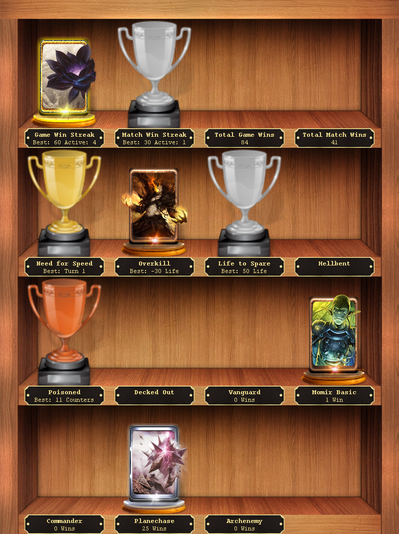 I've already covered all the alternate win conditions covered by the rules other than cards that say "You win the game" or "target player loses the game". For those win conditions, I'm planning to make a single, collection-style achievement where you earn a Bronze, Silver, or Gold based on the number of those cards you have successfully won a game with. I'll likely make Bronze require just one such card, Silver require 5, and Gold require 10.Marek14 wrote:Do you plan to add achievements for all alternate victory conditions?