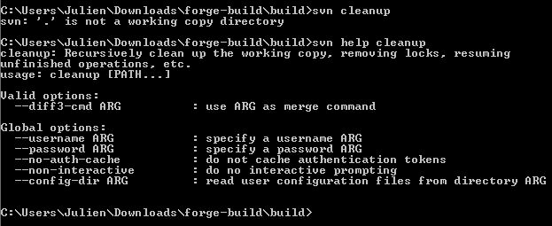 No, *svn.exe* isn't in forge-svn, but the downloaded sources are. It's being finicky because the script doesn't set up svn's path in the global PATH environment variable which would let it be accessed from anywhere(It doesn't need to, however.)