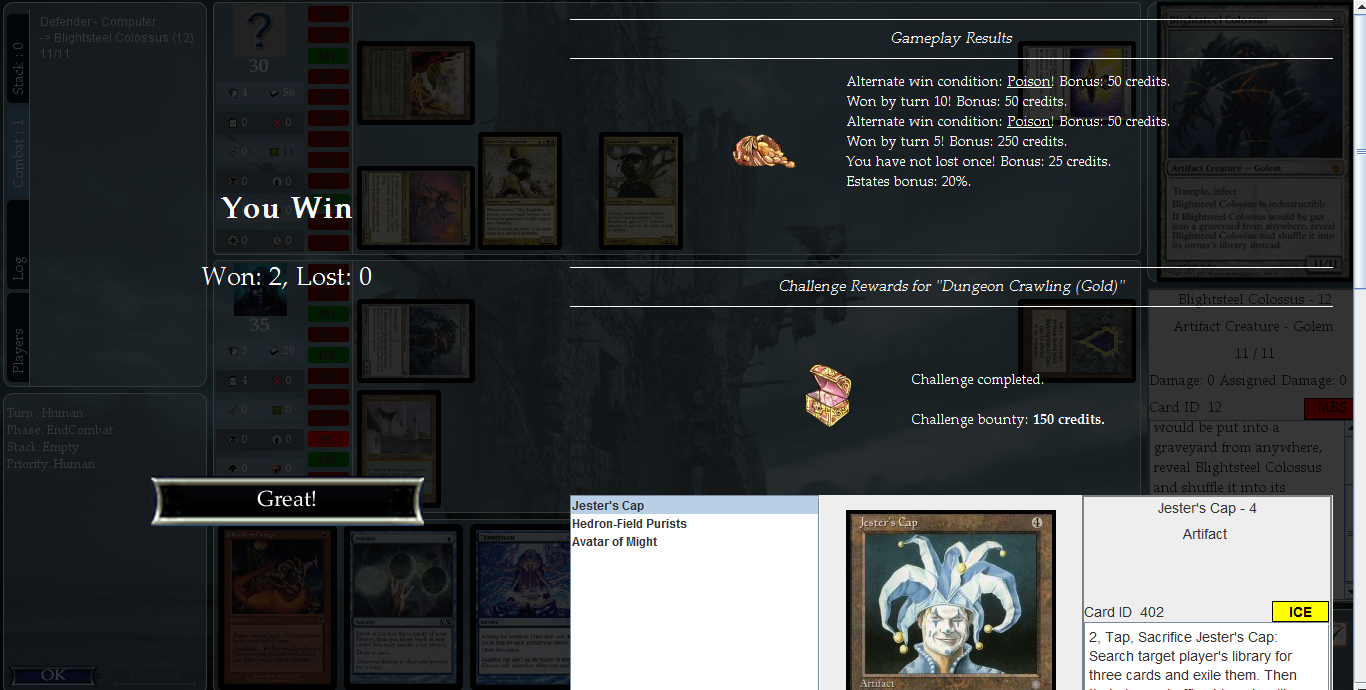 It looked a bit odd to me too, but it grew on me. This was an attempt to avoid the crowded, hard-to-read, multiple-scrolling space of before.Roujin wrote:It looks rather strange I must say, with the gameplay result to the right of the you win screen.