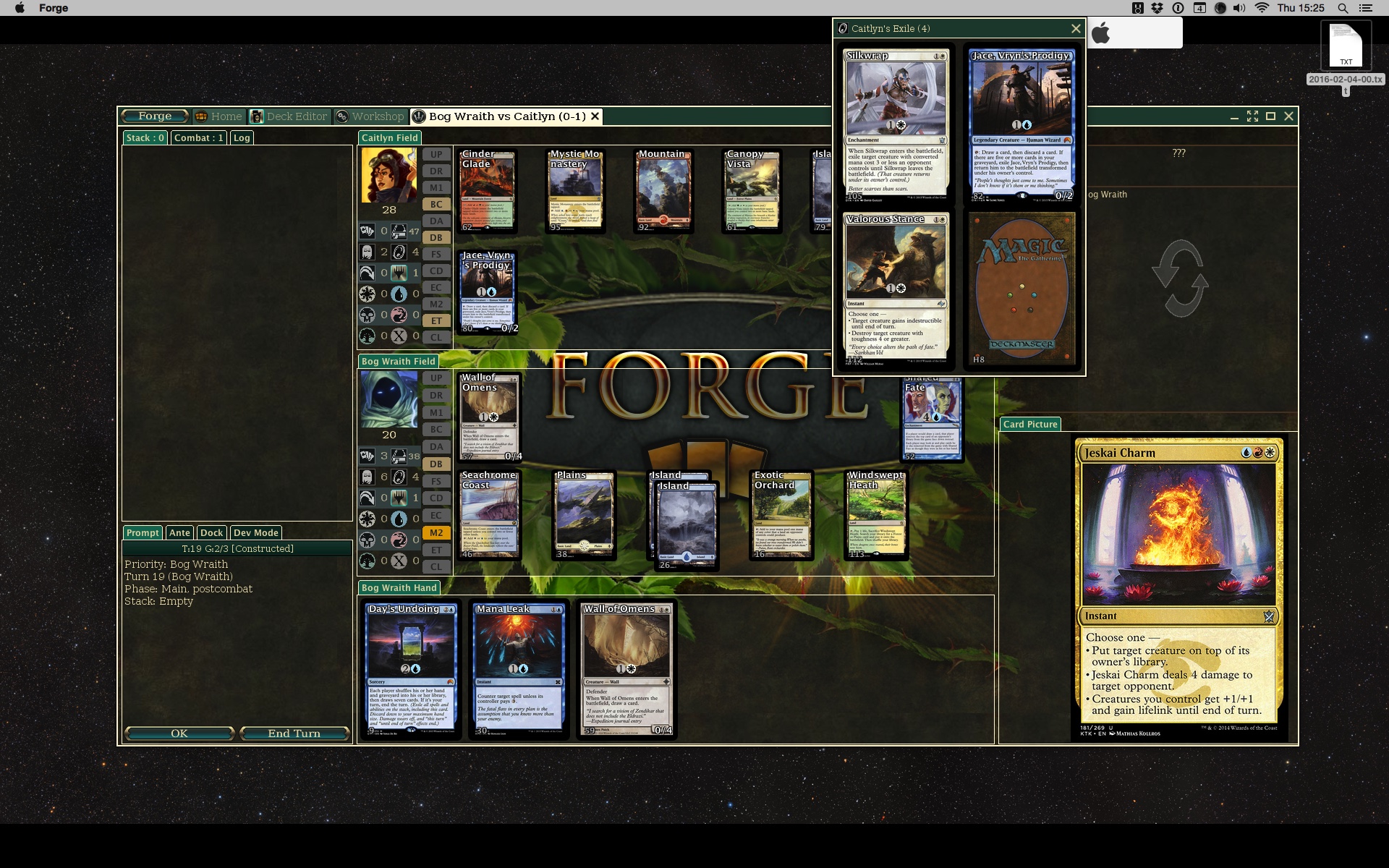 Ah thanks for the reminder. I meant to take a look but then OGW came out and absorbed all of my time with adding colorless mana.Bog Wraith wrote:I was able to play a bit, but the same kind of crash occurred once again when I attempted to cast the A.I's exiled card Jeskai Charm, using my Exotic Orchard to pay for the red mana cost of it when the crash happened: