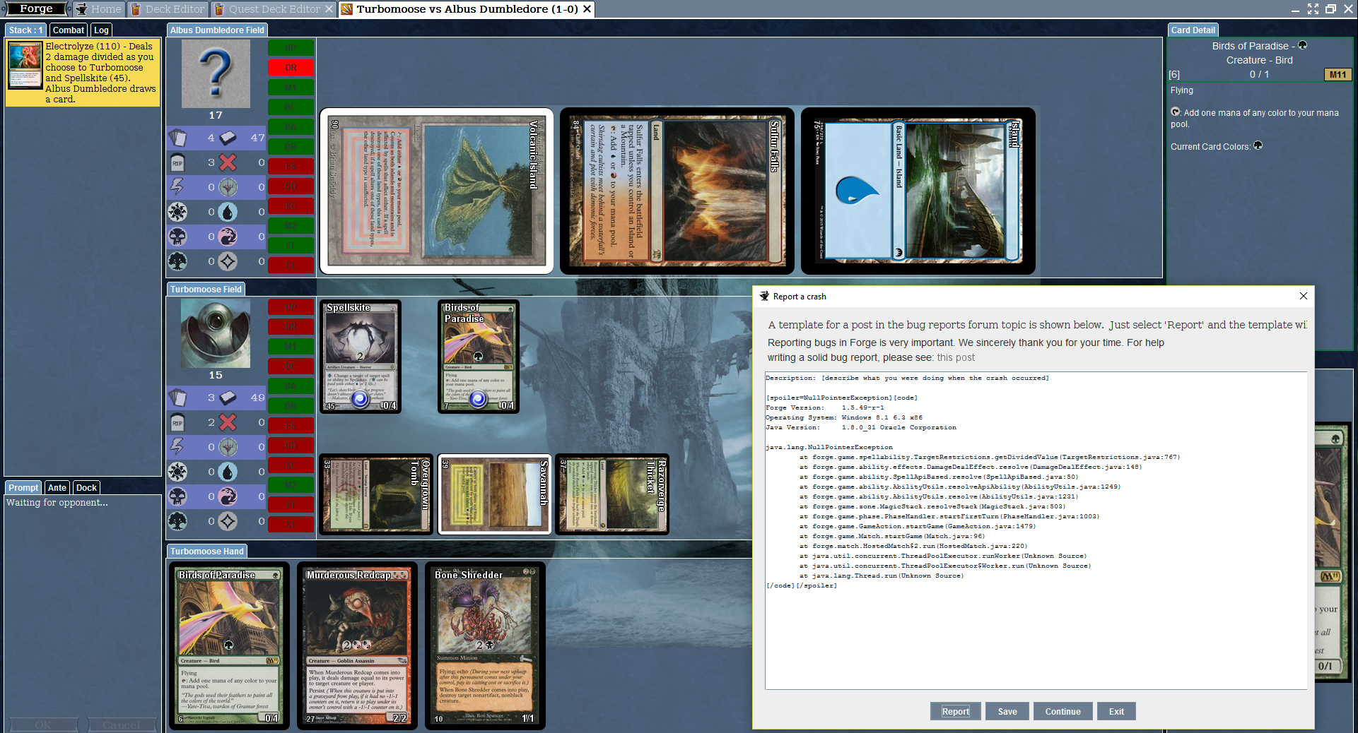 Got the following error when redirecting half of electrolyze from my birds of paradise to my spellskite. The other half of the electrolyze was targeting me. Beta 02-23-2016 ver 1.5.49