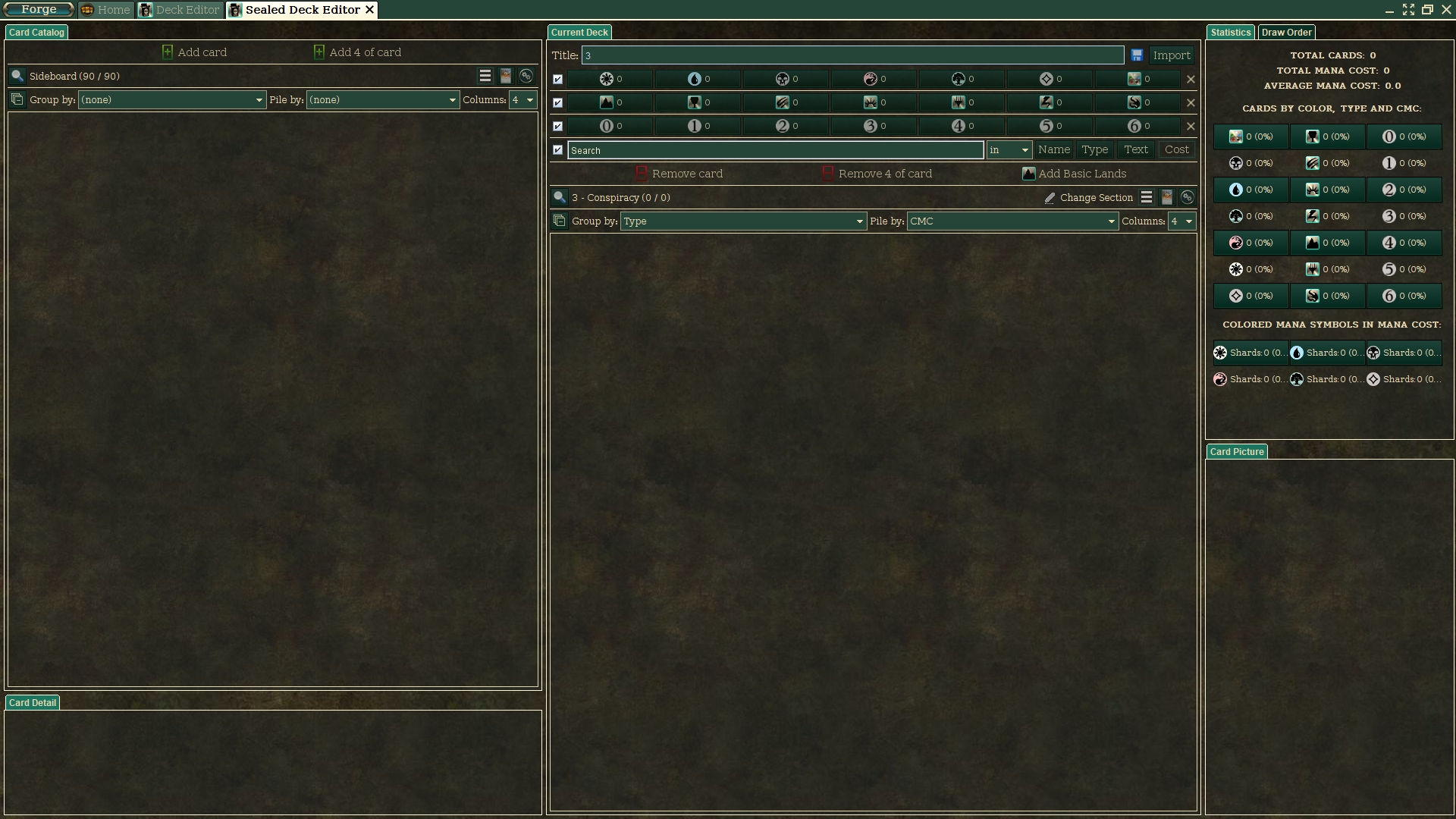 Hmm, I'm not sure what exactly you mean... The deck editor for this mode is a bit awkward and needs some improvement, but the basic idea is that when you switch over to the Conspiracy section, in the card pool you will see your sideboard (whatever you did not put into your main deck), including the possible conspiracies, and on the right you'll see the Conspiracy section of your main deck. Then, when you switch again, it'll be back to the Sideboard -> Main Deck mode.stormcat wrote:r35101
