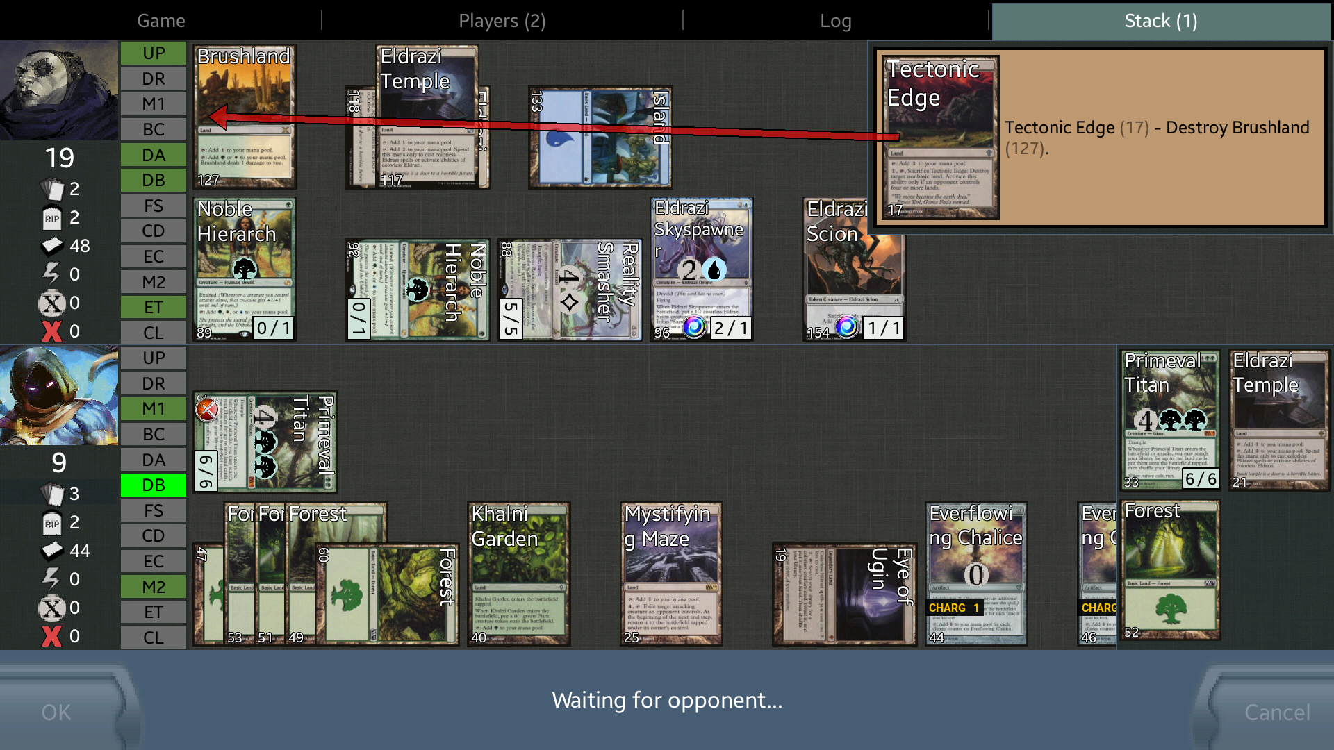 Activate Tectonic Edge to destroy opponent non basic land, NPE occurs. Using R35231