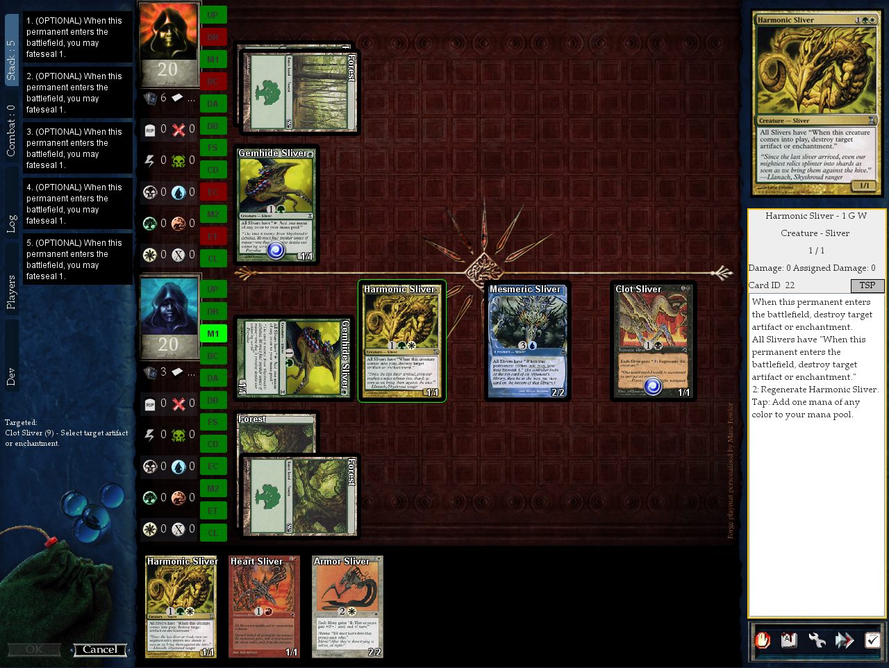 Hardcoded was a poor choice of wordsSloth wrote:The trigger doesn't have to be hardcoded. Just a normal trigger with "ValidCard$ Sliver.Self" should be enough.moomarc wrote:That's beyond my ability. I just dabble with code where I can see a pattern.ArsenalNut wrote:As to getting Harmonic Sliver to work, try changing the static effect to "Affected$ Sliver.Other" and add a hardcoded ETB trigger that works for the original sliver only.