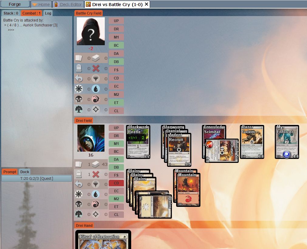I restarted Forge after the print on Screen1, started a match, this time with a simpler deck, a Preconstructed one ("Fiery Dawn"), same as my opponent ("Monstrous Surprise"), and as it's showing that I can play Kruin Striker, as it's being prompted, for Moorland Inquisitor this doesn't happen. Yes, I click cancel for the casting of Kruini before trying to play Moorland, of course. Nothing happens when I click in ANY of the other cards.