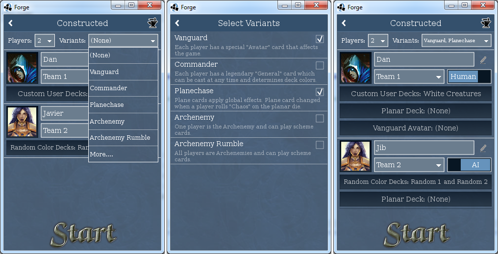 So it's been awhile since I've had an update, since I've been working on refactoring things. However, now that the refactoring is done, I can finally share another screenshot. I'm working on the Constructed screen so you can configure players, teams, decks, and variants. Here's what I've got so far: