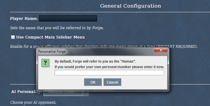 - This dialog will only be shown once on startup when PLAYER_NAME is empty. If you decline to provide a name then "Human" will be used as default and there will be no change from current behaviour.