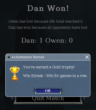 That said, maybe I can make achievements for each game mode. Maybe one set for Constructed, one for Booster Drafts, one for Sealed, and one for Quest mode. That way games played in Quest mode don't affect your Constructed achievements or vice versa, plus it would allow different types of achievements for Quest mode like collecting the power 9, which wouldn't work for Constructed.