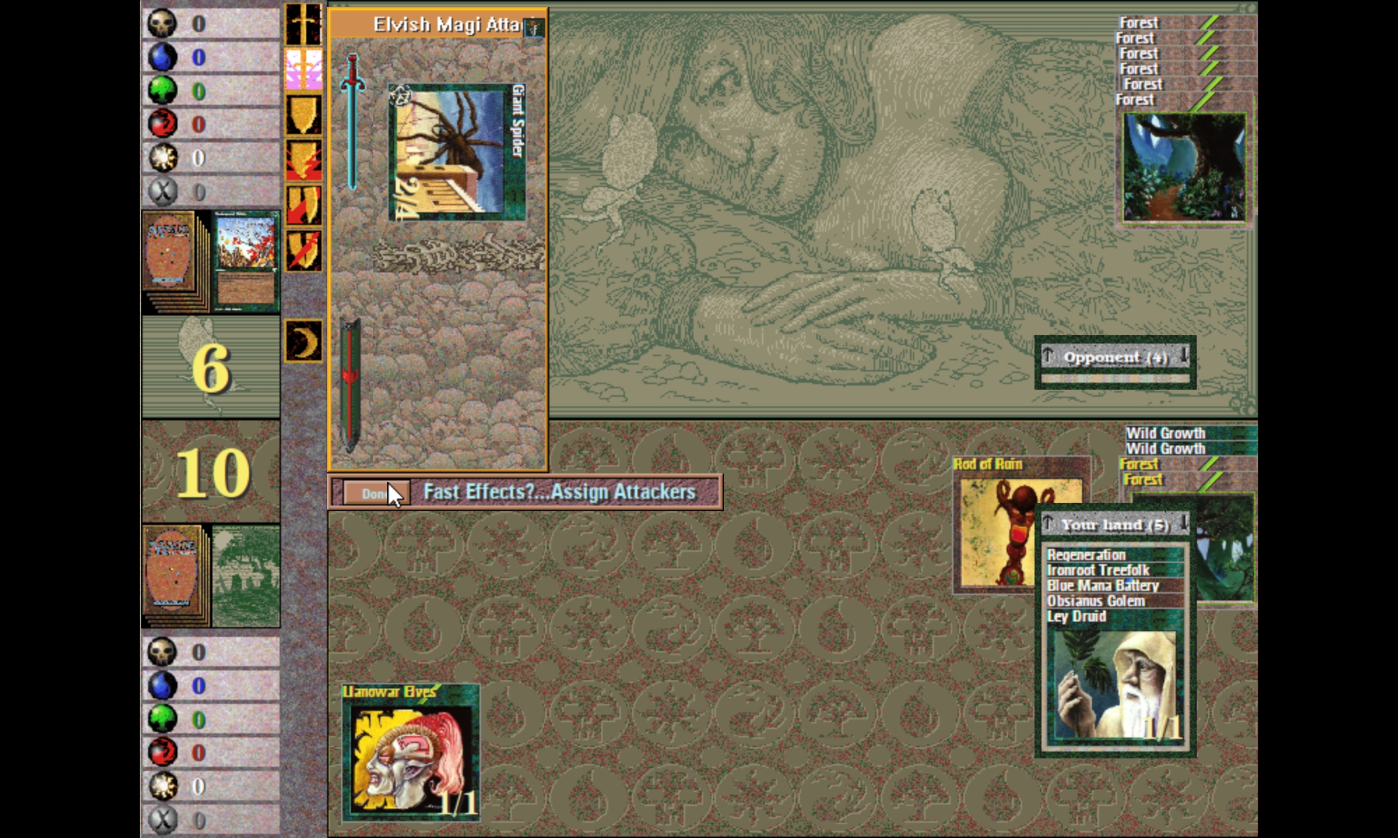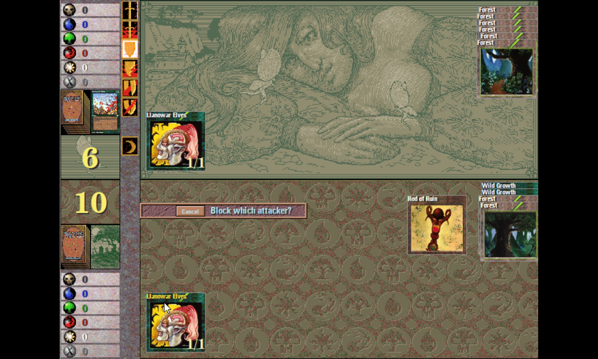 I got the game running nearly perfectly, which was a real thrill, but I still have one tiny issue. When I'm in combat mode inside of Shandalar, during the attack phase the attack pop-up window shows up when creatures for either side attack, but then when it goes to select your blockers, the pop-up box disappears and I cannot select the opponent's creatures to block. I do have an issue sometimes where your hand, the pop-up window for that, disappears, but if I go to the next turn step it usually reappears. I cannot find a similar workaround for this combat pop-up window and every time, no matter which one I try and which parameters, the pop-up window disappears when it's time to select which creatures I'm blocking and with which of my creatures, etc. So I can play the game I just can't do combat.