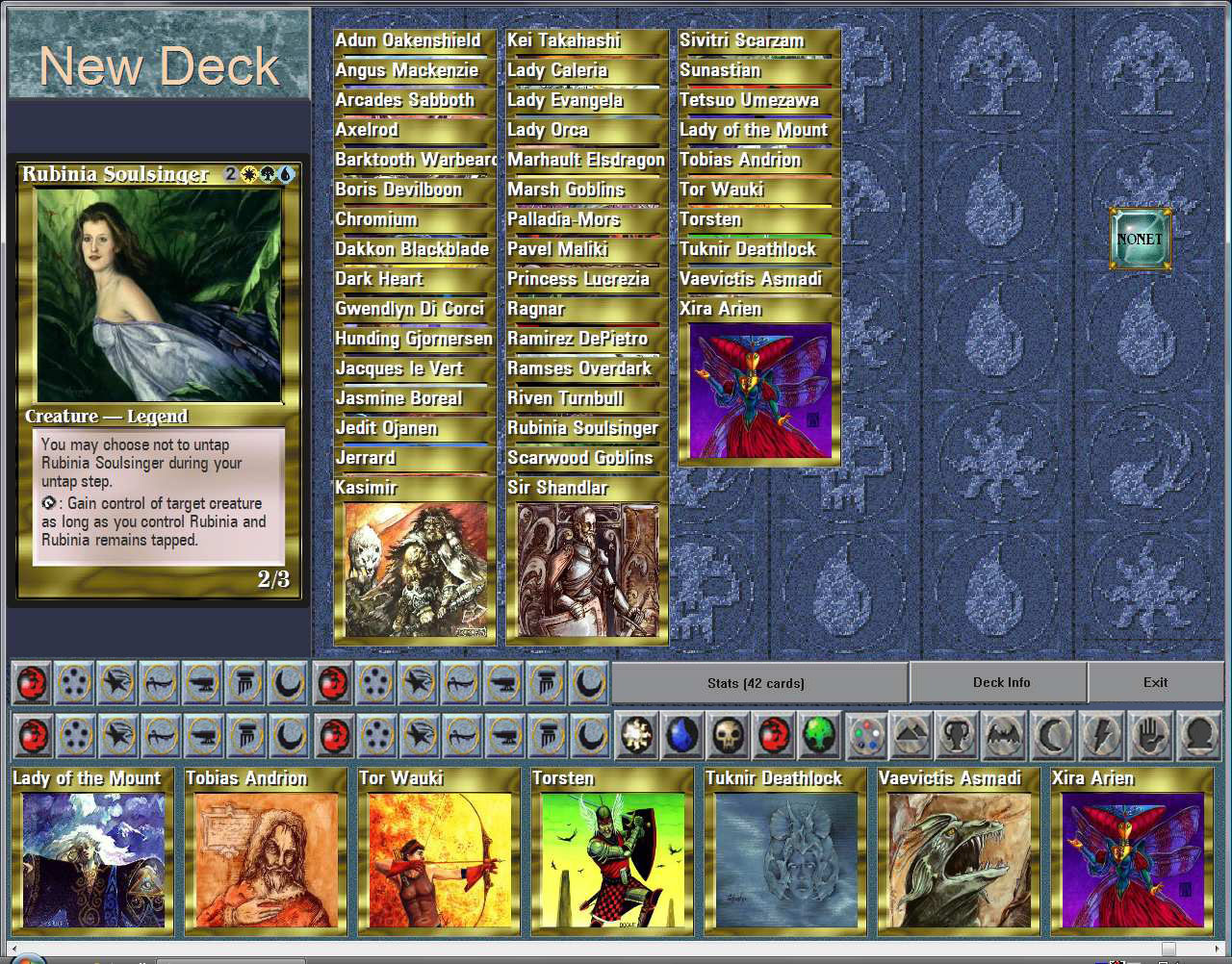 I may just cross my fingers and hopejatill wrote:I'm not doing anything fancy with my UI updates. I'm taking away the difficulty buttons and replacing them with 'Draft, Challenge Mode, Momir Basic, and Test Mode' basically. I like your idea for deck filtering. It's probably too hard for me to figure out, but maybe next time I'm not busy I'll play around for a couple hours.