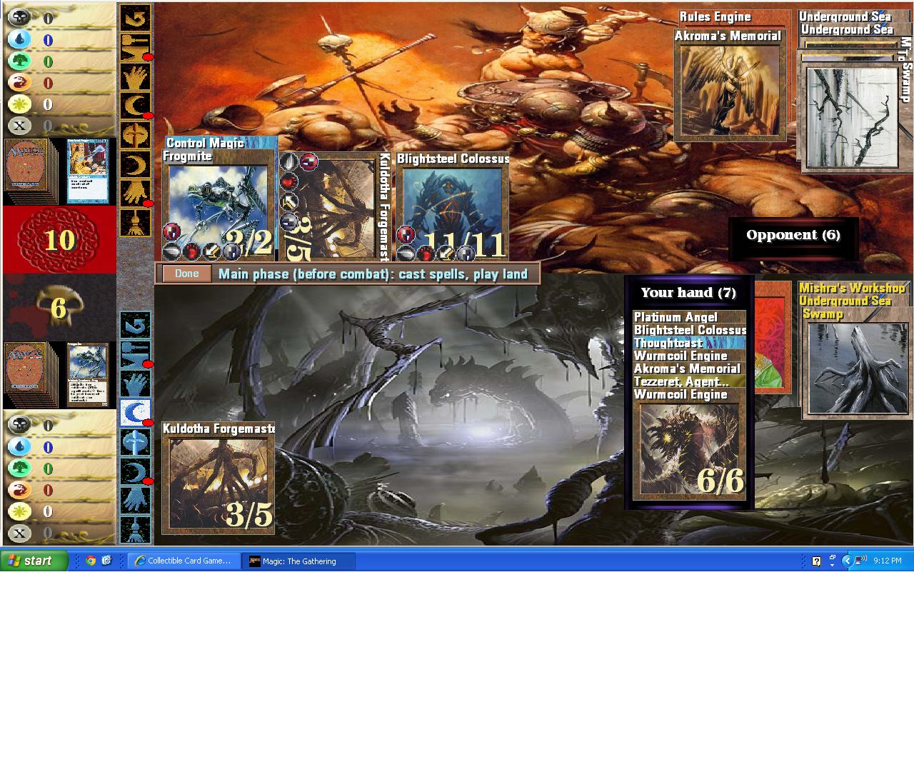 It's a lot like my first list, actually :p I toyed around with other decks based on stuff like Shriekmaw, Spectral Procession, Flame Javelin, and so on that can be played cheaper than 4 mana, but the power of the Workshop proved stronger. I know it has 27 land, but I seemed to be getting mana screwed a lot due to the high mana curve (typically on round 9-10 :p) so I tossed one of my 4-ofs (I forget what it was now) for 4 more islands.