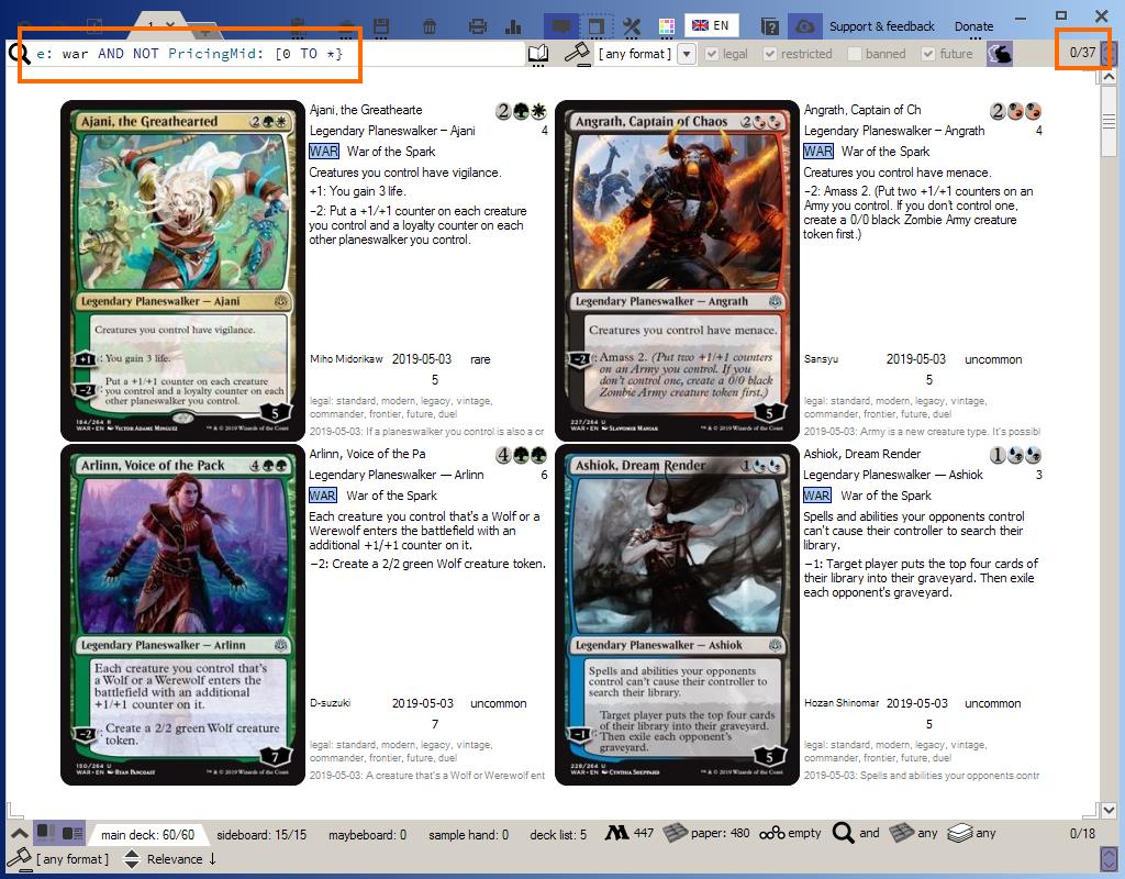 2. If 1. is ok, then try download mtgjson file from update window, then restart, wait until indexes are rebuilt so you can filter cards by WAR set