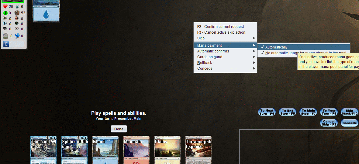 Has been happening to me for the last few hours. I play a spell, get prompted to pay for it, tap the lands for it, and nothing. Even tapping a pain land to select the proper color mana will take away life but not apply the mana to the spell cost. Ive been playing all day fine and then it happened in the middle of one my games. Since then every game I try and create or join does the same thing. I am up to date on the software and tried exiting, rebooting, etc.