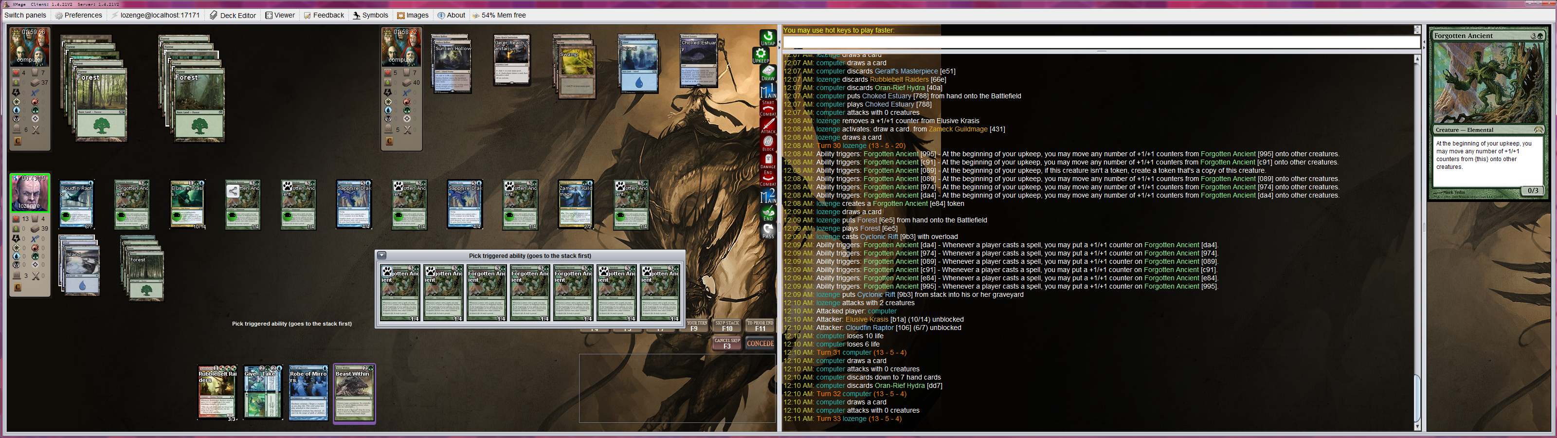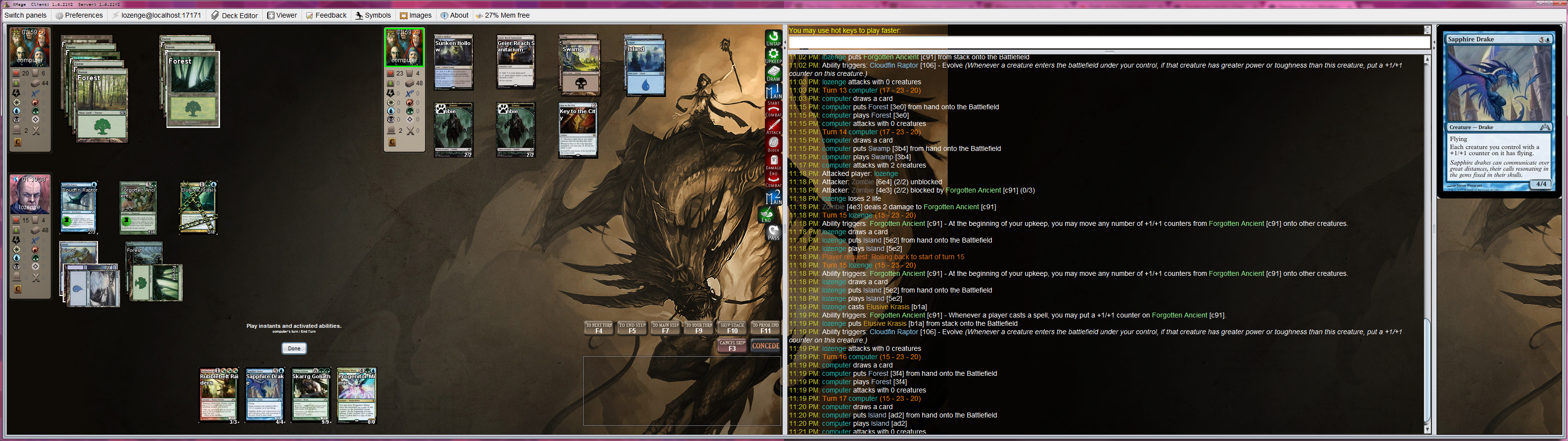 I have attached a screenshot of my current game. As you can see the computer players refuse to do anything. Poor computer player #1 is sitting on a nice amount of mana and nothing on the battlefield. Apparently he would rather keep it that way instead of giving me a few +1/+1 counters.lozenge wrote:This is kinda silly. When Forgotten Ancient is on the battlefield the AI players completely refuse to play any spells at all. They just go through their turns not doing anything (except possibly attacking if they have creatures on the battlefield.) I know they don't want to help me end up with a giant creature but I'll just win anyway because I'm the only one actually playing.