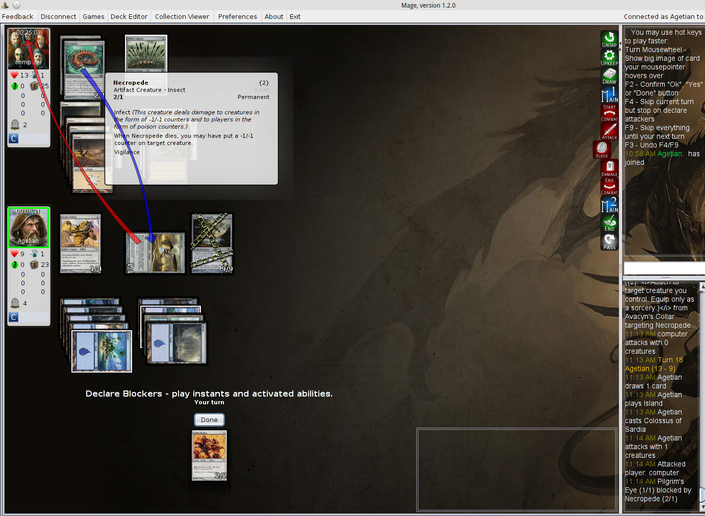 That's a bug that happens sometimes and it's not reproducable at will. There is some special logging added if this happens. So please check your server log file ( .../Mage.Server/mageserver.log). There should be a message with the following text: "Found non-flying non-reach creature blocking creature with flying".Agetian wrote:I was playing a game against the AI opponent ("mad"). The AI blocked my Pilgrim's Eye (flying) with his Necropede equipped with Avacyn's Collar. There were no cards on the battlefield that granted flying to Necropede, so I believe it was an illegal block. Here's a screenshot in case I'm missing something:battlefield-glitch-mage.jpg