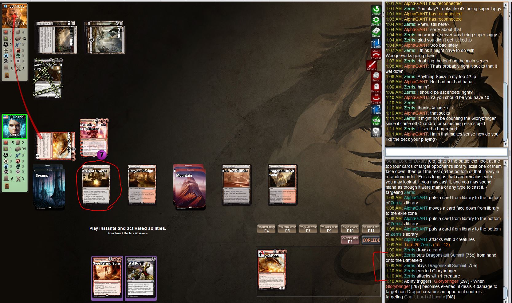 1:06 AM: Zerris moves Glorybringer [297] from library to the exile zone