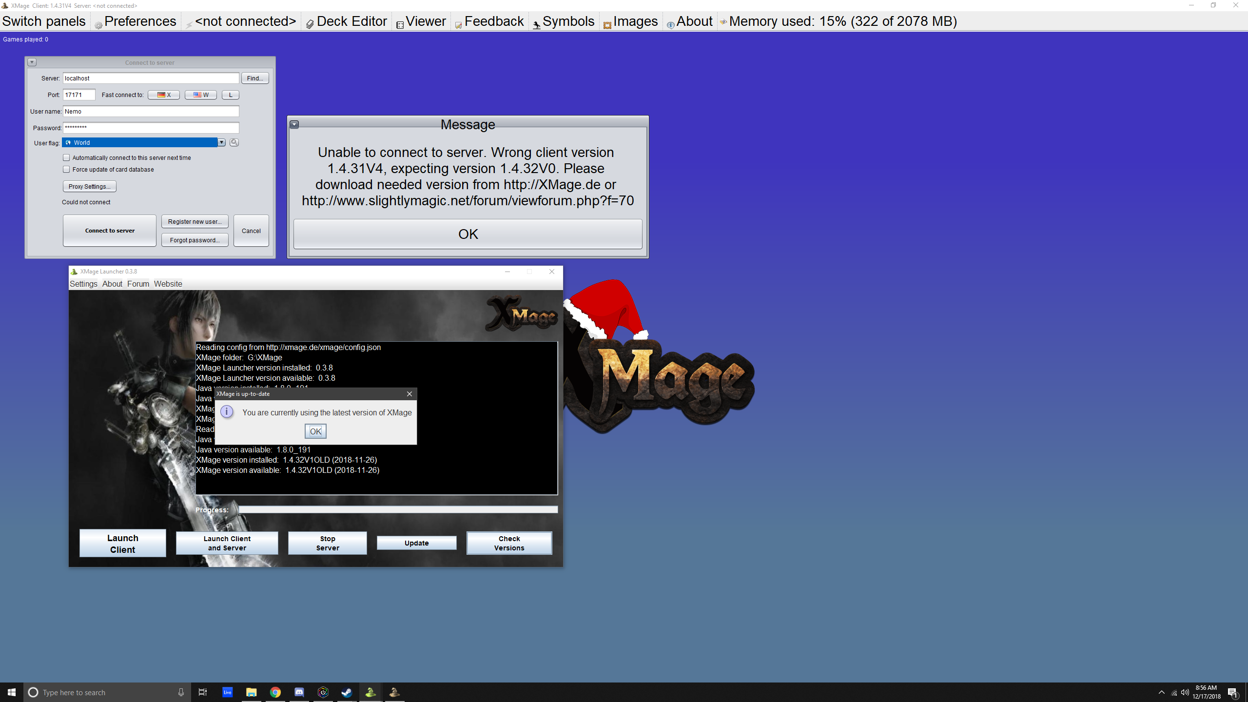 3. If that's not working too then you can try to reset xmage settings to default (instructions -- delete HKEY_CURRENT_USER\Software\JavaSoft\Prefs\mage\client).