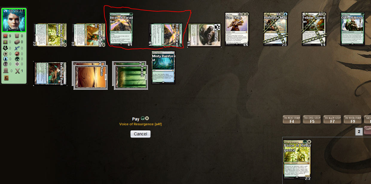 XMage wouldn't let me tap my Birds of Paradise to pay for Voice of Resurgence (and then froze up the game entirely) - this is the game just post-concession (at which point, it tapped the first bird I'd clicked). Notice that post-concession, it still wants me to pay mana.