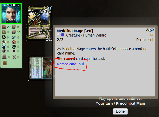 If you cast Meddling Mage, you get disconnected from the server, then returned to the game in progress. You will discover that Meddling Mage is on "null". Happened in all three games I tried to cast it.