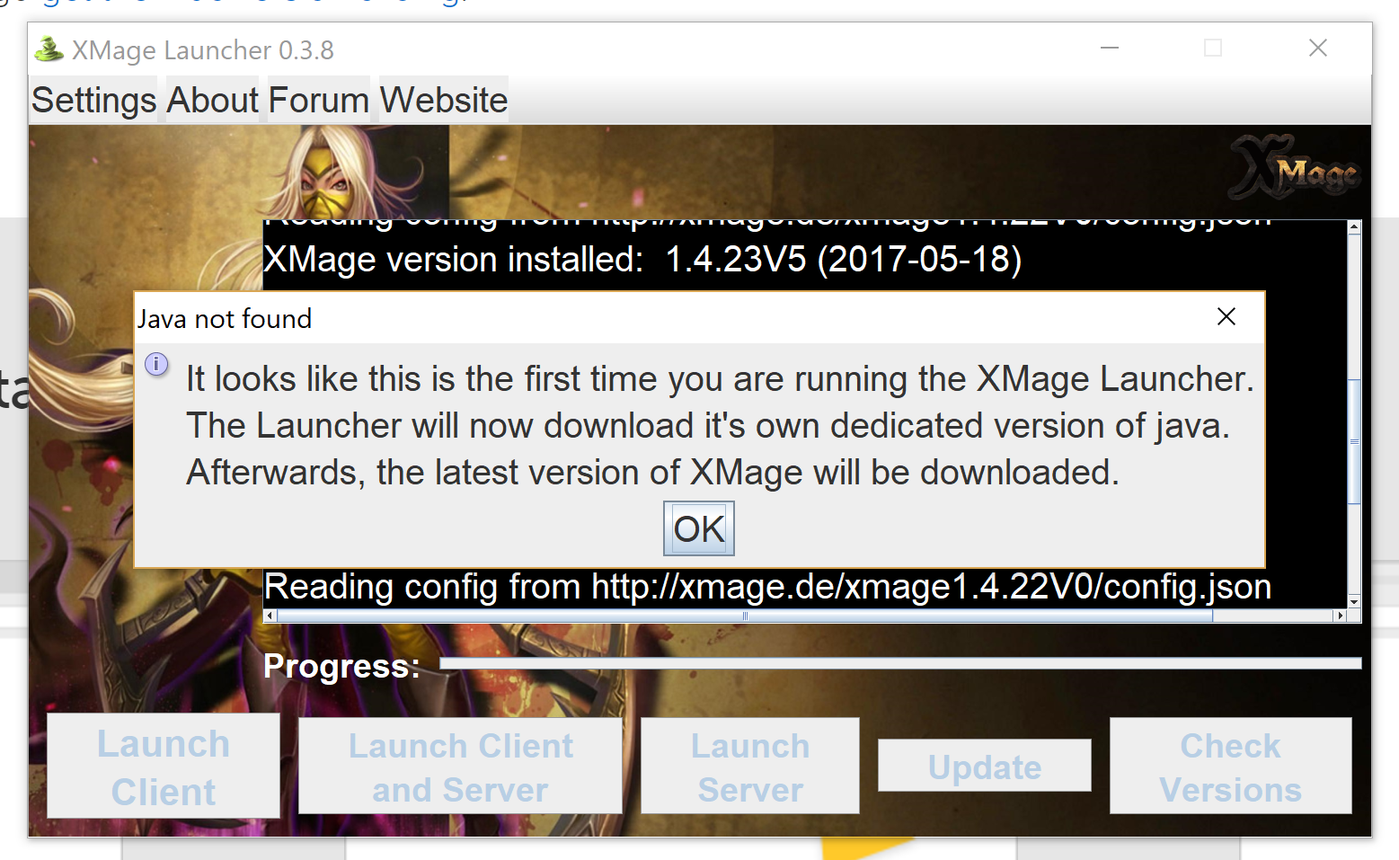 "It looks like this is the first time you are running the XMage Launcher. The Launcher will now download it's own dedicated version of jave. Afterwards, the latest version of Xmage will be downloaded."