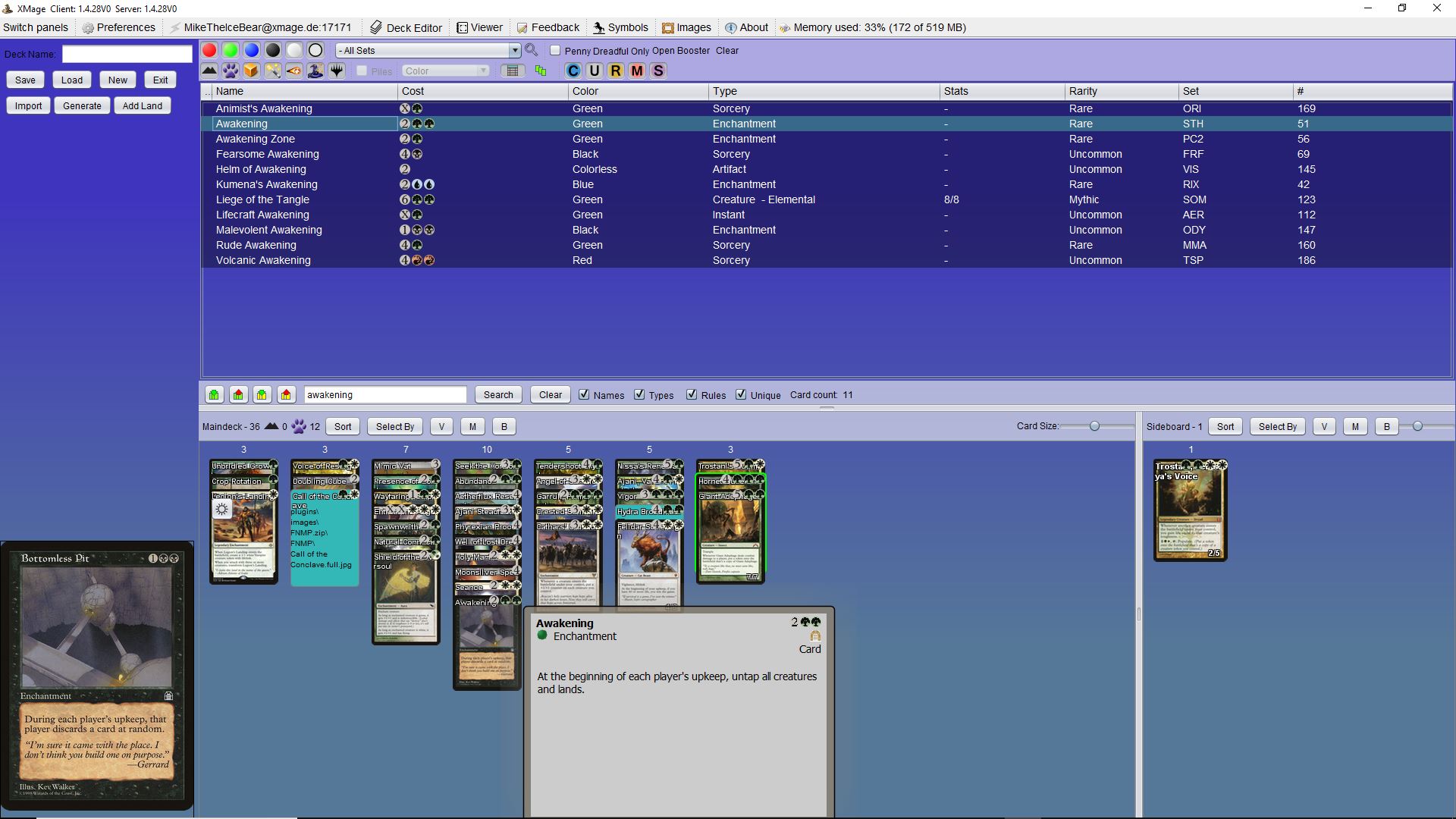 There are a lot of older cards that have wrong art. I think most from alpha to urza block have wrong art. You can fix this by downloading bugged sets from:MikeTheIceBear wrote:When you try and search the card, "Awakening" it turns into a "Bottomless Pit" instead and keeps the art. However, if you select it and hover over the card, it will have the effect of "Awakening" in the card description window despite it being the other card. Below is an attachment.