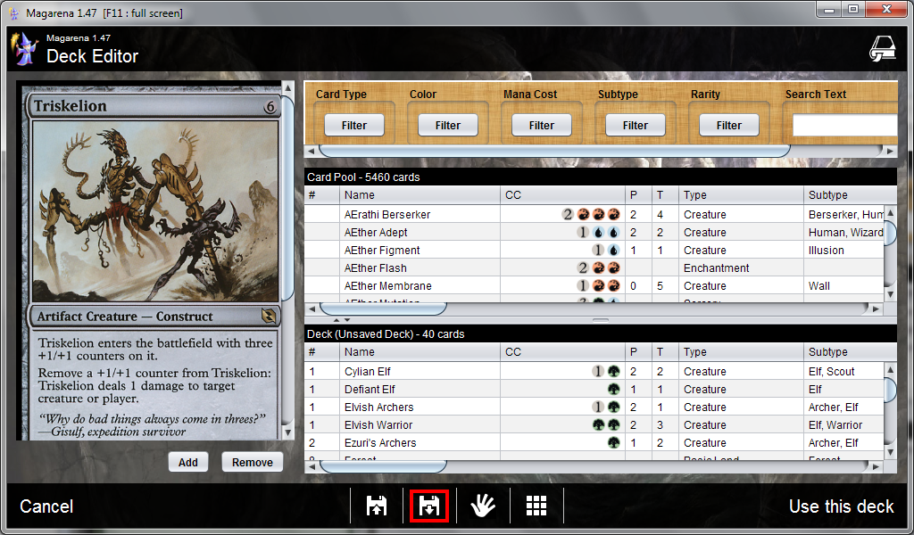The Save Deck is available via the Deck Editor. But you have to open the options menu to access it first. I have just published an update that adds Save to the action bar and should be available in the next build.muaddib wrote:There is no option 'save deck' in menu, but in Magarena 1.44 this option present in menu.