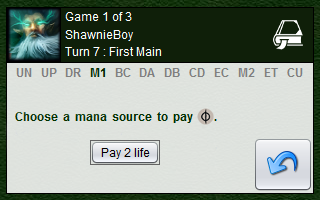 Phyrexian mana can't use the normal mana prompt, as there's nowhere to select 'Pay 2 life', so that's why the button prompt is being used. So something like this would be perfect if the code behind it could work. (Assuming that in this example, black mana sources are being highlighted on the battlefield. So a choice between the button or mana, if mana is possible, if not then no prompt and 2 life is paid right away.)