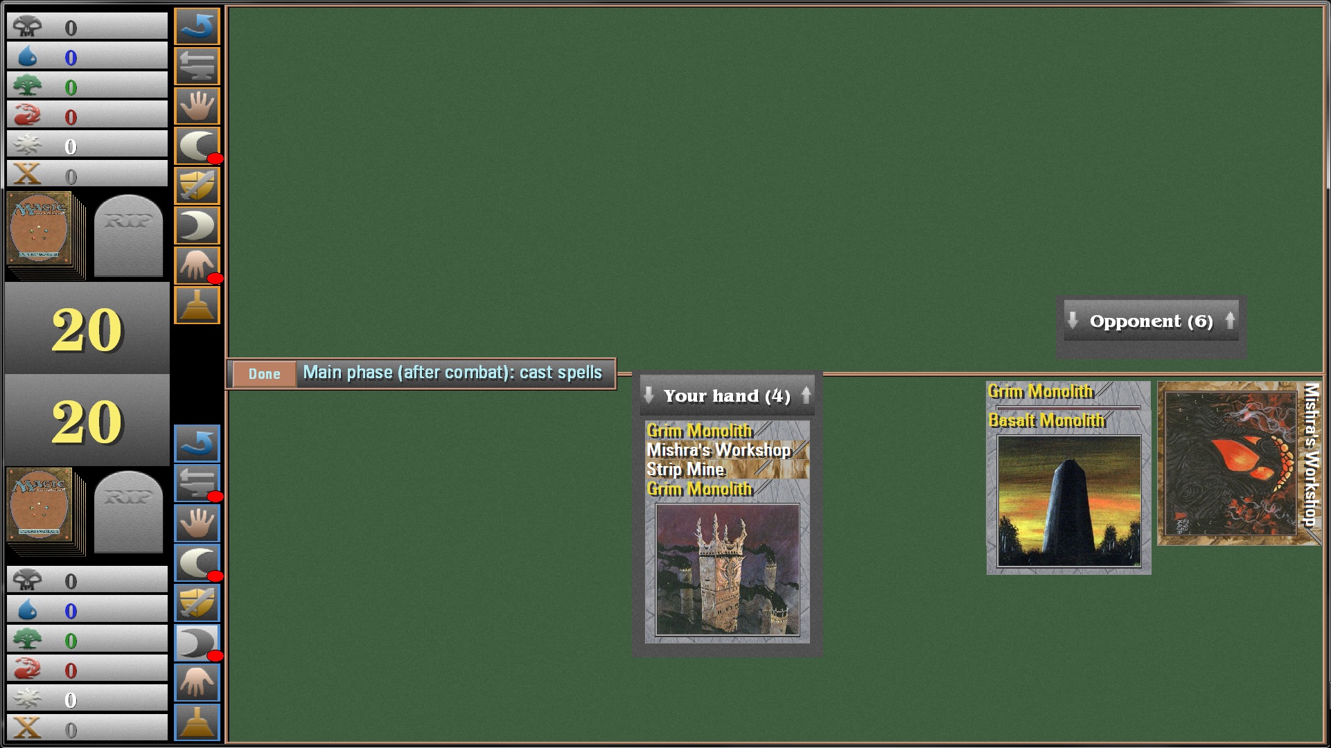 In the attached screen shot, I played Grim Monolith using Mishra's Workshop during first main phase. Advanced to second main phase to empty my mana pool. And then double clicked Basalt Monolith in my hand, clicking on Grim Monolith to pay for it. As you can see, Grim Monolith did not tap.