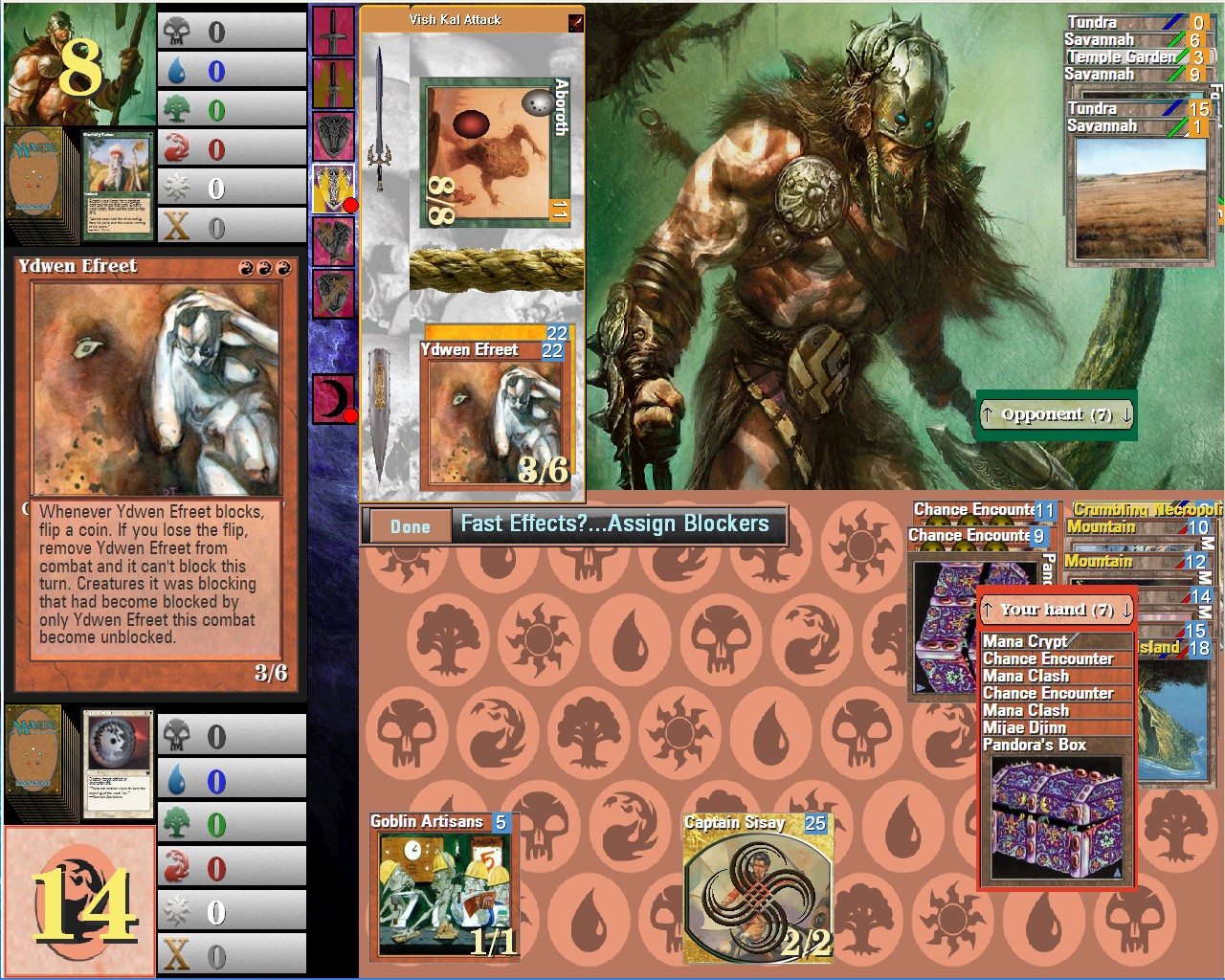 Ydwen Efreet still is not being removed from combat when it blocks and you loose the flip coin.Not removed both visually or actually so Ydwen Efreet deals/suffers damage from attacker instead of player.A legacy card gets attached to it but it seems to do nothing.
