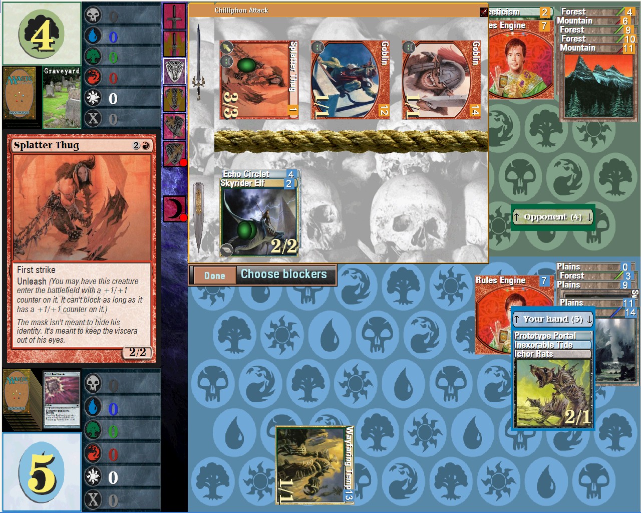 I have in play Skyrider Elf equipped with Echo Circlet and a tapped Wayfaring Temple AI is attacking with an unleashed Splatter Thug and 2 1/1 goblin tokens.I assign Skyrider Elf as a blocker then:
