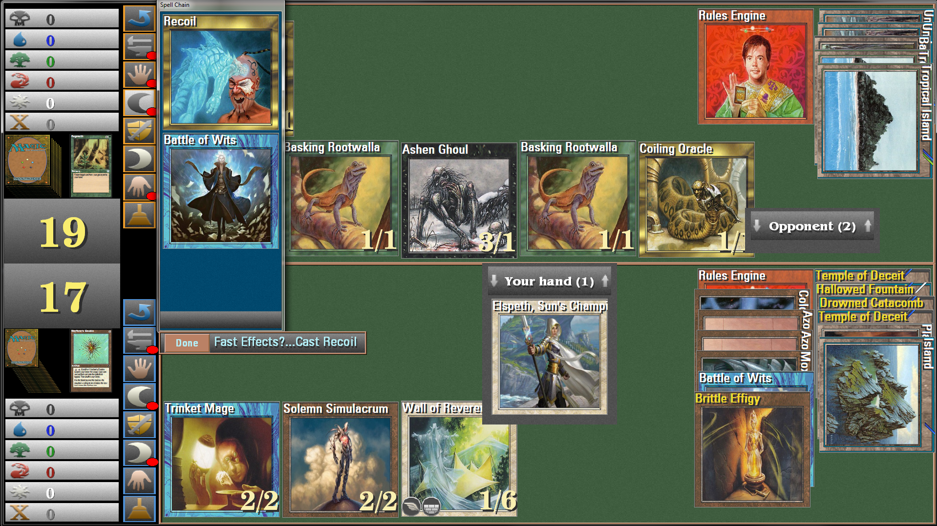 Interesting, I actually saw a scenario where the AI had Voltaic Key and Time Vault in play (the AI has never been good about actually taking unlimited turns). Despite having sort of randomly taken many extra turns, it failed to decide to take an extra turn when I had a Battle of Wits out, thus losing. I assume this is the same logic as Time Walk where it does not know to avoid losing by denying me a turn?Korath wrote:One thing it won't do is try any harder to cast Time Walk or Eon Hub or such so that you don't get an upkeep for it to trigger in, and if cards like Stifle worked, it probably wouldn't cast it to counter the upkeep trigger either. Though the AI hardly needs more encouragement to cast Time Walk, I guess.