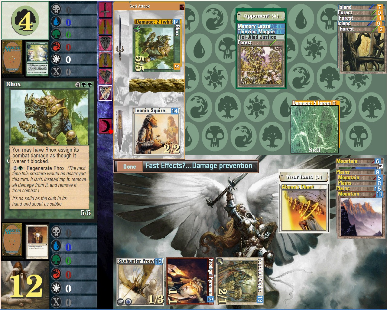 For Bubble Matrix and Angel of Salvation, at least, it's timestamp-dependent, since both they and Rhox do their thing during EVENT_PREVENT_DAMAGE. Put the Matrix on the bf or create the Angel's damage shield (on the blocking creature) before the Rhox enters the bf, and the latter's combat damage gets prevented whether it's assigned to a creature or player. Create the Angel's damage shield on the defending player before the Rhox enters the bf, and it'll never prevent damage. (If part of the Angel's damage shield is on the blocking creature and some of it on the defending player, then the shields on the creature prevent damage and the ones on the defending player do not, regardless of whether Rhox's ability is used.) Put the Rhox on the bf first, and it works properly in all cases.Aswan jaguar wrote:Rhox works fine with cards like Buble Matrix, or prevention shield like Angel of Salvation or protection from green like Cerulean Wyvern.
