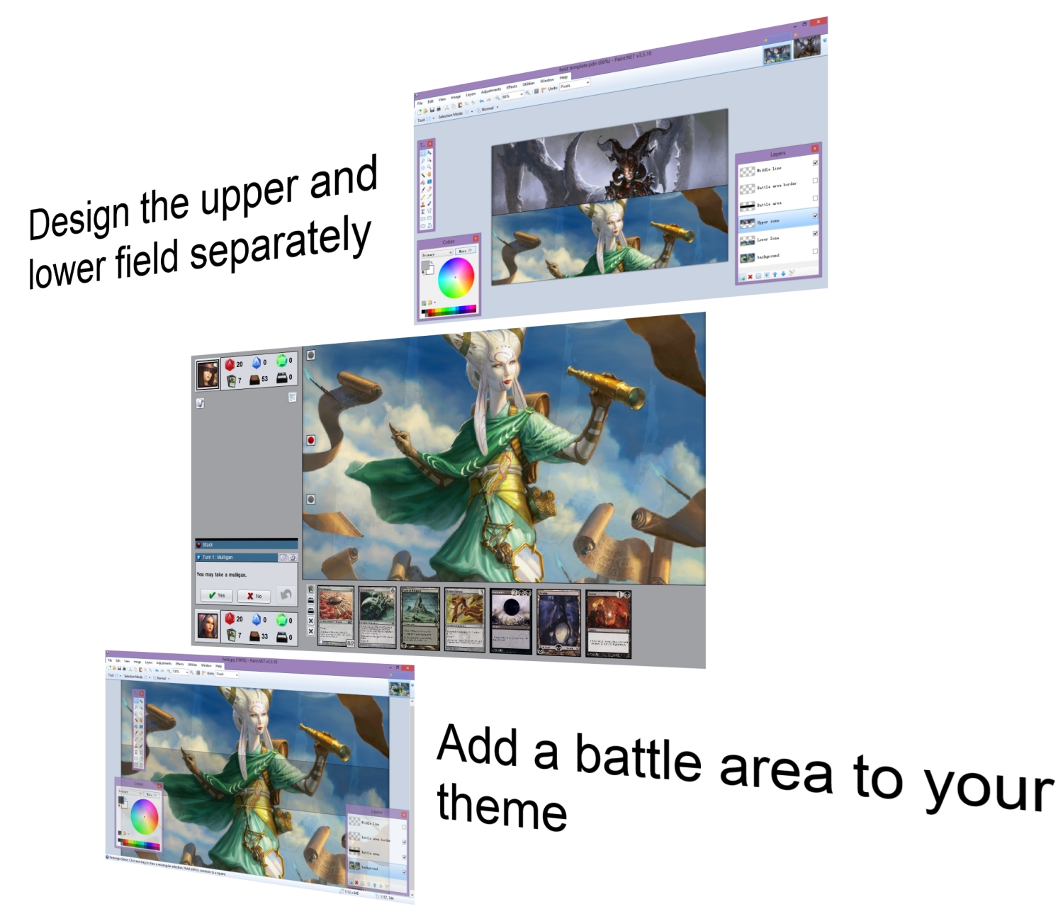This is a rather simplistic theme with colors based on the tables and menus used in Magarena. Because of this any background should look fine with this theme. The icons are dices and MTG cards and should look good with any background. In the .zip file you will find the Harmony theme and also a .pdn file that can be used with the freeware Paint.Net to create your own background (replace the existing field.jpg). This .pdn file contains all the necessary layers so it's mostly a matter of copying and pasting your desired background.