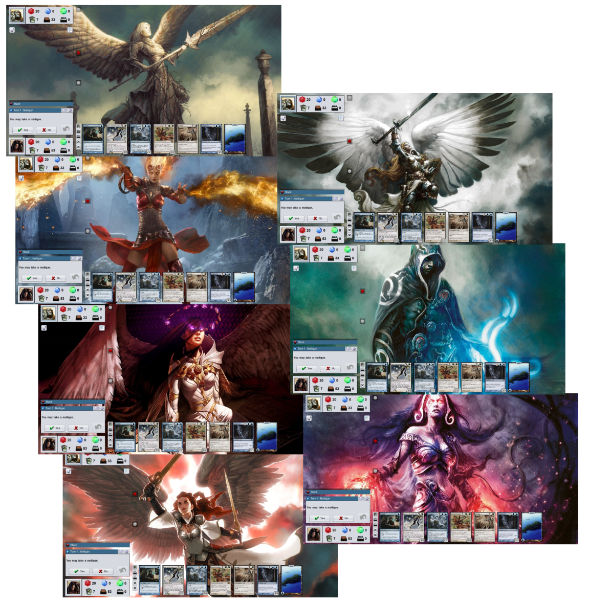 These playmat themes are based on Harmony (playmat) which is a playmat theme template based on the original Harmony theme template (using colors to blend in with Magarena's default colors and the dice and MTG card icons). Therefore any background should look good with this theme.