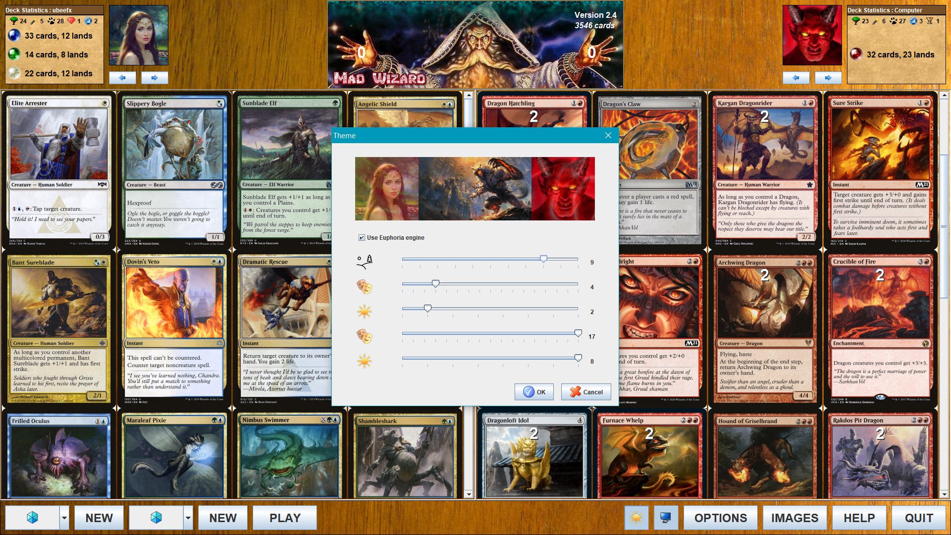 The new theme dialog. Select background, avatar and foil. Enable or disable Euphoria mode.