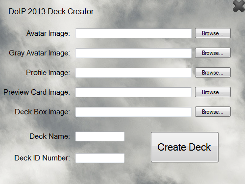 To get started on a deck all you need is five textures (avatar, gray avatar, profile, deckbox, preview card), a deck name, and a unique deck ID number; the program will create a deck directory in a DC_OUT folder.