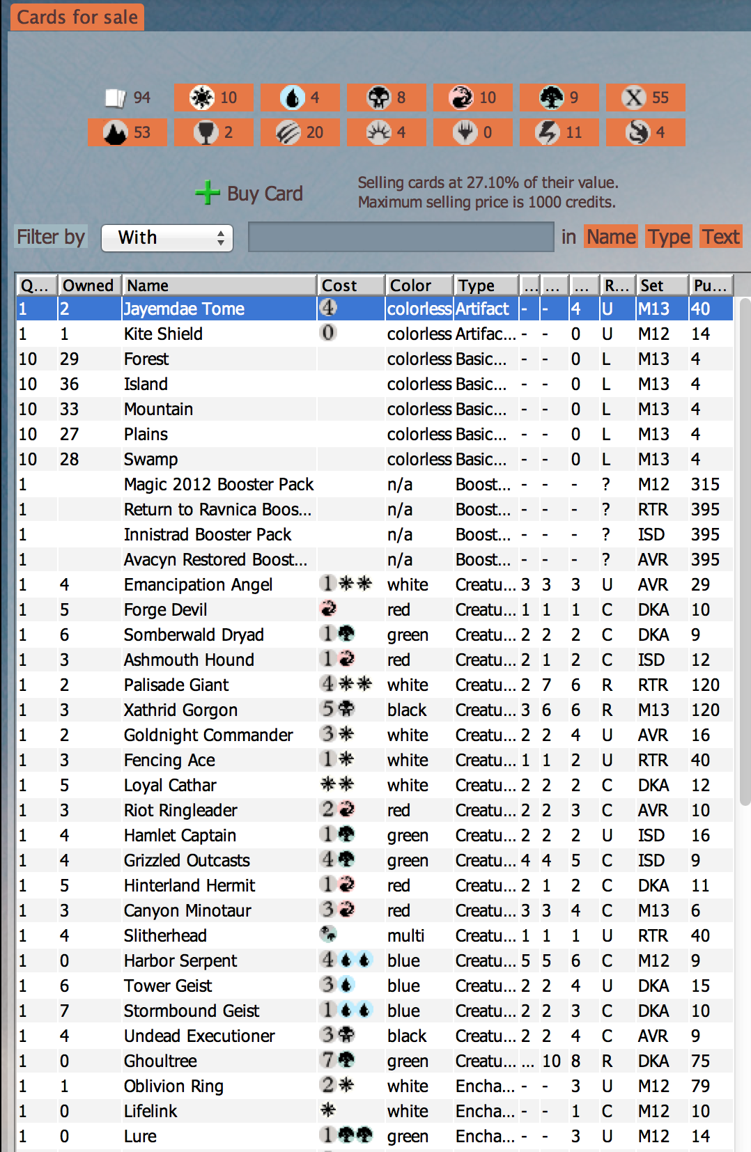 Another idea related to this: how about an additional column in the spell shop that indicates how many of each card you own. then you can set a filter if you like to only show cards which you own 0 to 3 of. This would provide more information than a button that just filters out the "4 or more" cards.jwallstone wrote:I have a very simple and time-saving request. When buying cards from the shop in Quest Mode, a lot of time is spent just checking if I already have a full playset of a card before buying. It would save a lot of time to have a simple filter to hide cards that I already own 4 copies of.