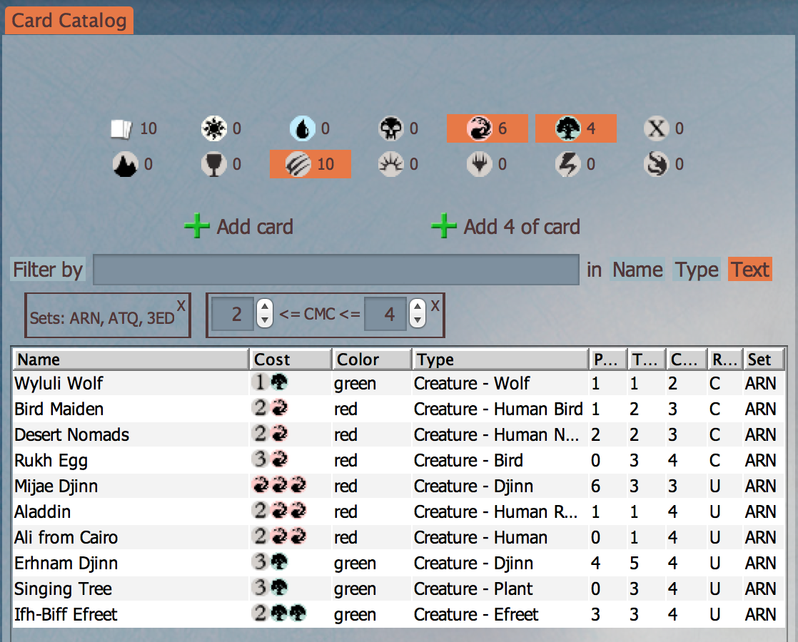 I would suggest making three separate input fields for Name, Text, and Type so you can do more complex searches like "goblins with haste".myk wrote:I had something like that in my original design, but the UI started to get cluttered. Let me toss some screenshots together with a couple options and tell me what you think.Xitax wrote:I think it would be better to have a button for opposite logic, similar to the other highlight buttons, labeled "not"myk wrote:[*]hit ctrl-shift-enter (cmd-shift-enter on osx) -- of course you could also do this by selecting the "Inverse of current search string" menu item