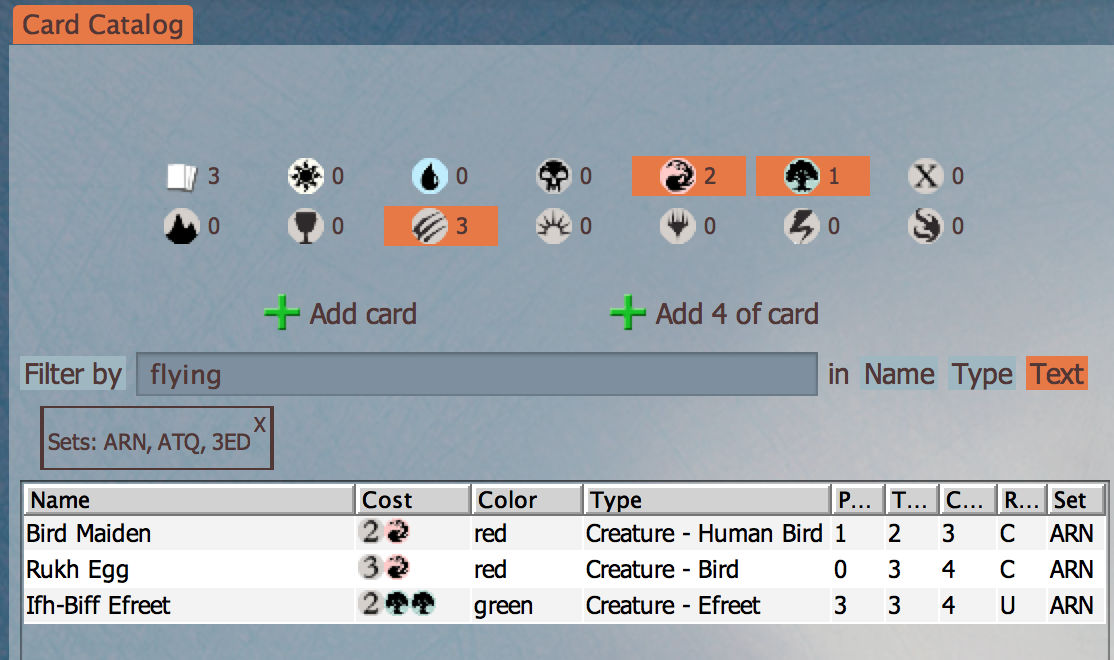 I just took a look at the advanced search page for Gatherer -- there definitely is some good functionality there. It would take a separate UI page to implement, though. Not to say it can't be done -- it could be implemented in a dialog that comes up when you select "Advanced search" from the "Filter by" popup menu. The advanced search would be added to the restriction list just like the other restrictions.ArsenalNut wrote:I would suggest making three separate input fields for Name, Text, and Type so you can do more complex searches like "goblins with haste".