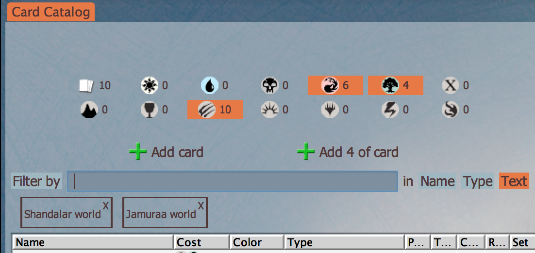 I would suggest making three separate input fields for Name, Text, and Type so you can do more complex searches like "goblins with haste".myk wrote:I had something like that in my original design, but the UI started to get cluttered. Let me toss some screenshots together with a couple options and tell me what you think.Xitax wrote:I think it would be better to have a button for opposite logic, similar to the other highlight buttons, labeled "not"myk wrote:[*]hit ctrl-shift-enter (cmd-shift-enter on osx) -- of course you could also do this by selecting the "Inverse of current search string" menu item
