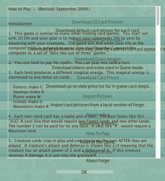 size How To Play and License Details overlay panels correctlyadd newly created scheme/planar decks to selection listsensure challenges are available when they are supposed to becould not repro (and neither can original reporter)only play sound event once at a time (stutter in untap phase when many cards are getting untapped, for example)don't propagate changes to current deck when you select 'no' at the save promptreevaluate cursor position when activating a card so tabbing off the application window then clicking back onto it doesn't tap the last highlighted cardReport Bug dialog doesn't work (do we want it to go to cardforge, or just format a post template for the forum?)- refresh screen on attack phase so auto-attacking creatures show their sword badges