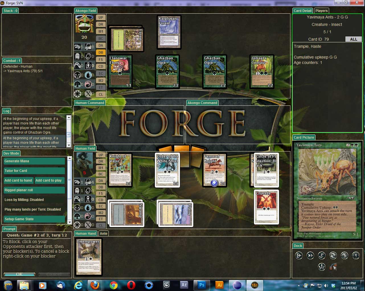 In the above image I'm being attacked by Yavimaya Ants and can't do anything about it because I can't click on it to target or assign blockers. Also, my Femeref Scouts seem to be trying to hide behind my CoP:Black (which was of no use to them of course).