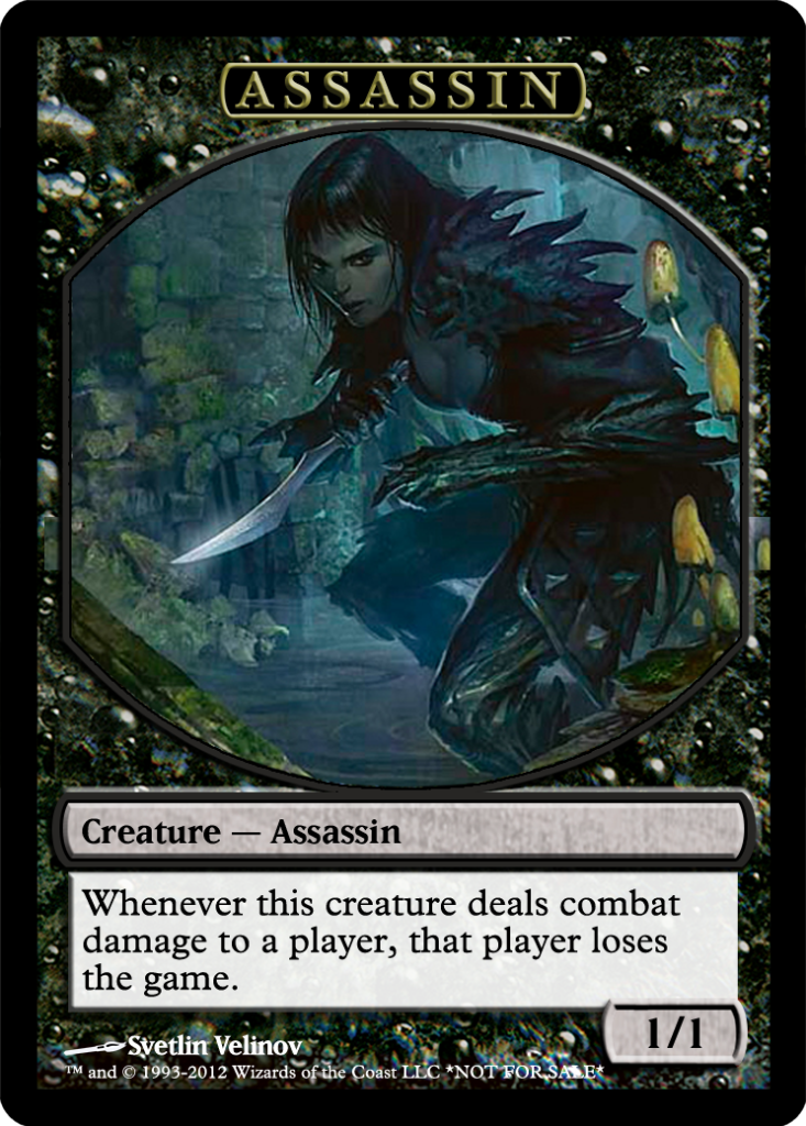 For the Assassin token, to implement her [Whenever this creature deals combat damage to a player, that player loses the game] triggered ability I was looking @ the Felidar Sovereign and Phage the Untouchable codes provided by this community to get an idea of how to assign the effects but I'm sure the coders and programmers here can provide me with a quicker and more suitable way to attach her ability to achieve the desired result.