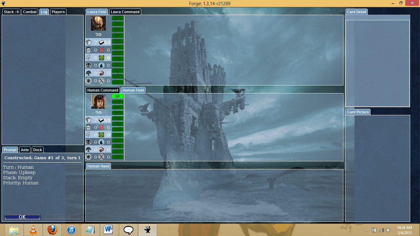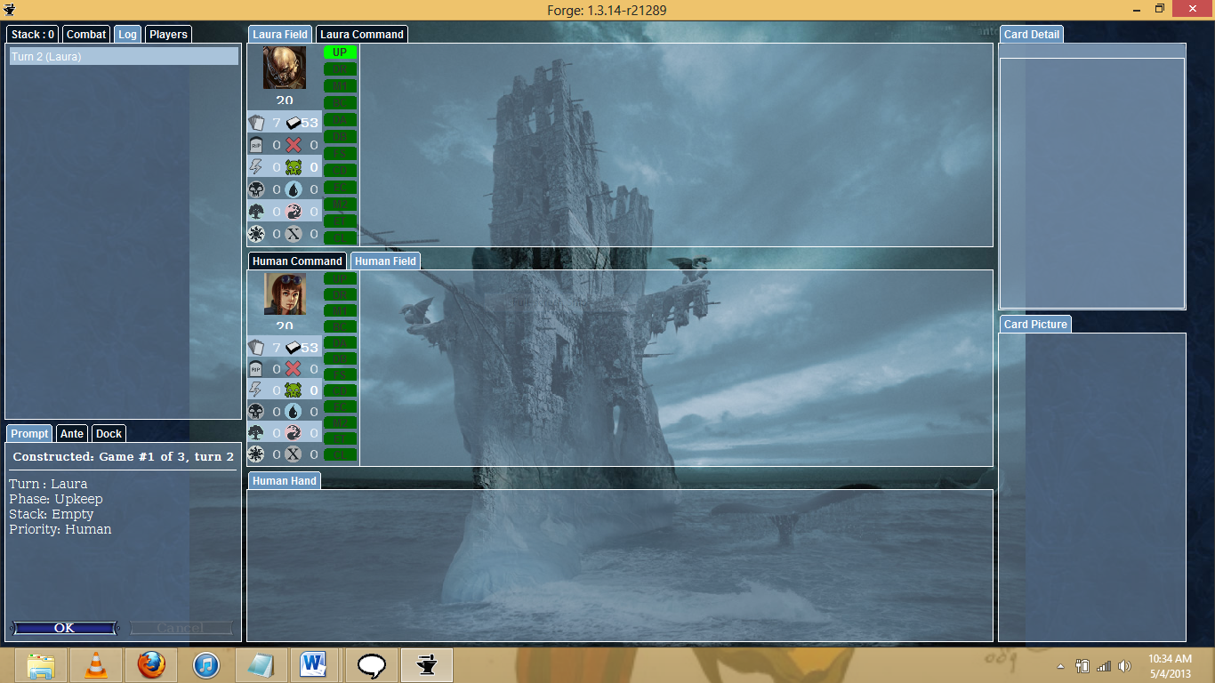 thanks for the advice I have attached the screen shotsmelvin wrote:Hi blade22031, welcome to Magarena. Could you see your opening hand if you start second in the turn? It will be helpful if you could send a screenshot showing the missing hand to magarena@googlegroups.com or post it here. Thanks! Tracking this issue as https://code.google.com/p/magarena/issues/detail?id=349blade22031 wrote:So when I start a game, I can never see my opening hand until after the computers first turn. It is at the draw step that the hand is revealed on my second turn. after that everything works fine. I have tried uninstalling and reinstalling yet the problem persists. Please help and thank you
