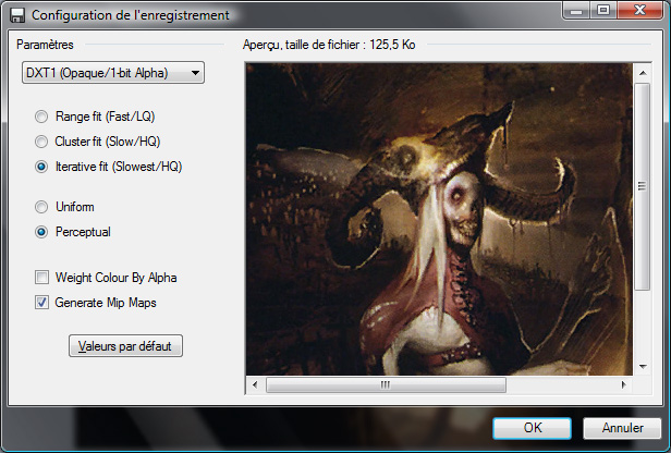 In fact I've looked at the original TDX pictures with a hex editor and they're compressed with DXT1, no need to have an alpha layer... so we can uncheck the "weight color by alpha" option. As you can see the resulting file is 126k, which is exactly the size of the original game files