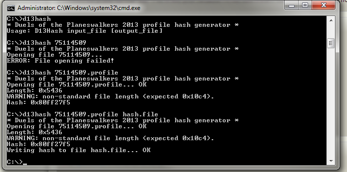 I finished editing my profile in the hex editor and saved it, but I'm having some trouble getting the hash generator to work. I'm using Win 8, disabled UAC by editing the registry and I still get an error when I try to do it. Here's what I typed in an Administrative Command Prompt: C:\Users\Steve>C:\D13Hash\D13Hash.exe xxxxxxxx.profile hash.file