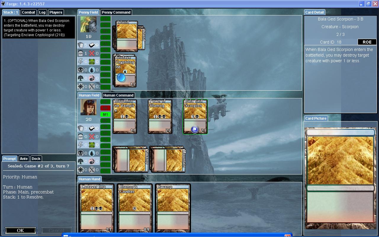 Description: Crash! Bala Ged Scorpion comes into play targeting Enclave Cryptologist with 1 level-up counter on him.