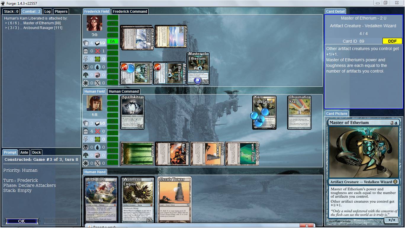 Thanks for the awesome program. I have been enjoying playing Standard and Modern for the last couple of weeks since I discovered it. I have, however, encountered the following bug. The AI had 2 Master of Etherium in play (one with summoning sickness) and an Arcbound Ravager. I controlled a Spellskite, a Chromatic Star and a Karn Liberated on 10 counters. Upon declaring attackers (the AI attacked Karn Liberated), the system crashed with the following: